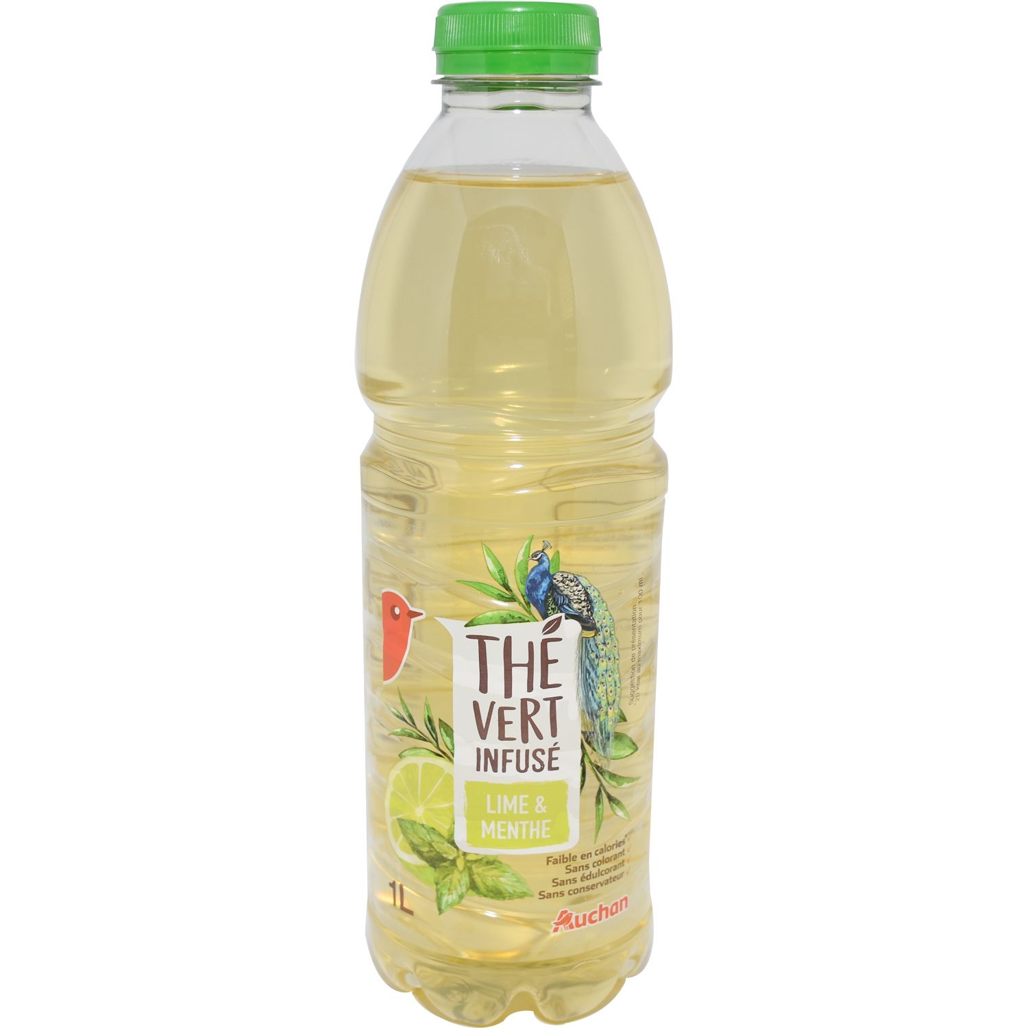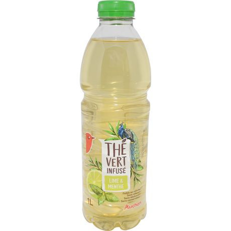 infusion de thé vert (dosage de l'extrait sec: 1.2 g/L), sucre, jus de limette 1%, arôme naturel, acidifiants: acide citrique et acide ascorbique, extrait de menthe poivrée.
