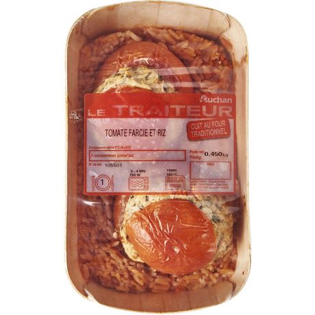Ingrédients : INGREDIENTS : Tomate 35%, eau, viande et gras de porc 19% (origine : France), riz 7%, oignon, préparation à base de tomates concentrées, concentré de tomate, persil, échalote, sel, huile de colza, tomate, ail, arôme naturel, thym, sucre, poivre, épaississant : E415. Traces éventuelles de gluten, oeuf, moutarde, poissons, soja, céleri, crustacés, mollusques, fruits à coque, graines de sésame, lait