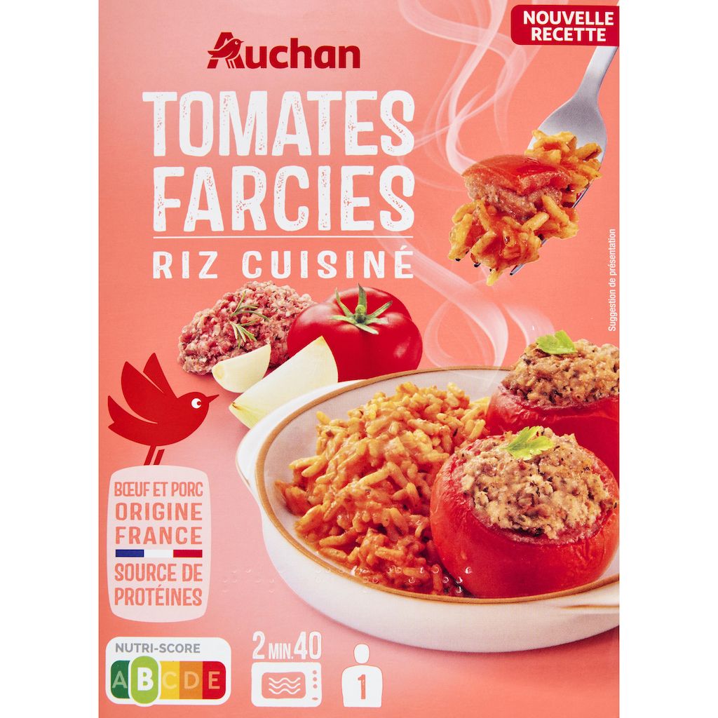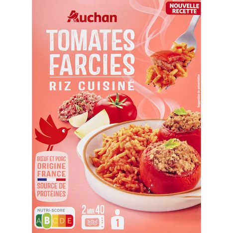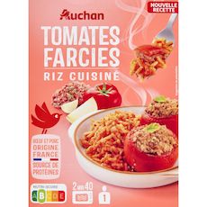 Ingrédients : Tomates Farcies 62,8 % (tomate 40%, viande de porc 10,9%,viande et gras de porc 4,8%, oignons 2.7%, viande de bœuf 2,7%, persil 0,7%, ail,sel, poivre, romarin 0.007%, thym, basilic, marjolaine), riz cuisiné 37,1% [riz cuit17,3% (riz, eau), pulpe de tomates au jus 12,4% (tomates, jus et pulpe detomates), huile de colza, double concentré de tomates 1,8%, oignons 1.4%, ail,persil 0.5%, sel, poivre, romarin 0.006%, thym, basilic, marjolaine].Pourcentages exprimés sur le total de la recette.Elaboré à partir de porc et bœuf origine France.Traces possibles de : poisson, crustacés, mollusques, œufs, lait, soja, moutarde, céleri, gluten