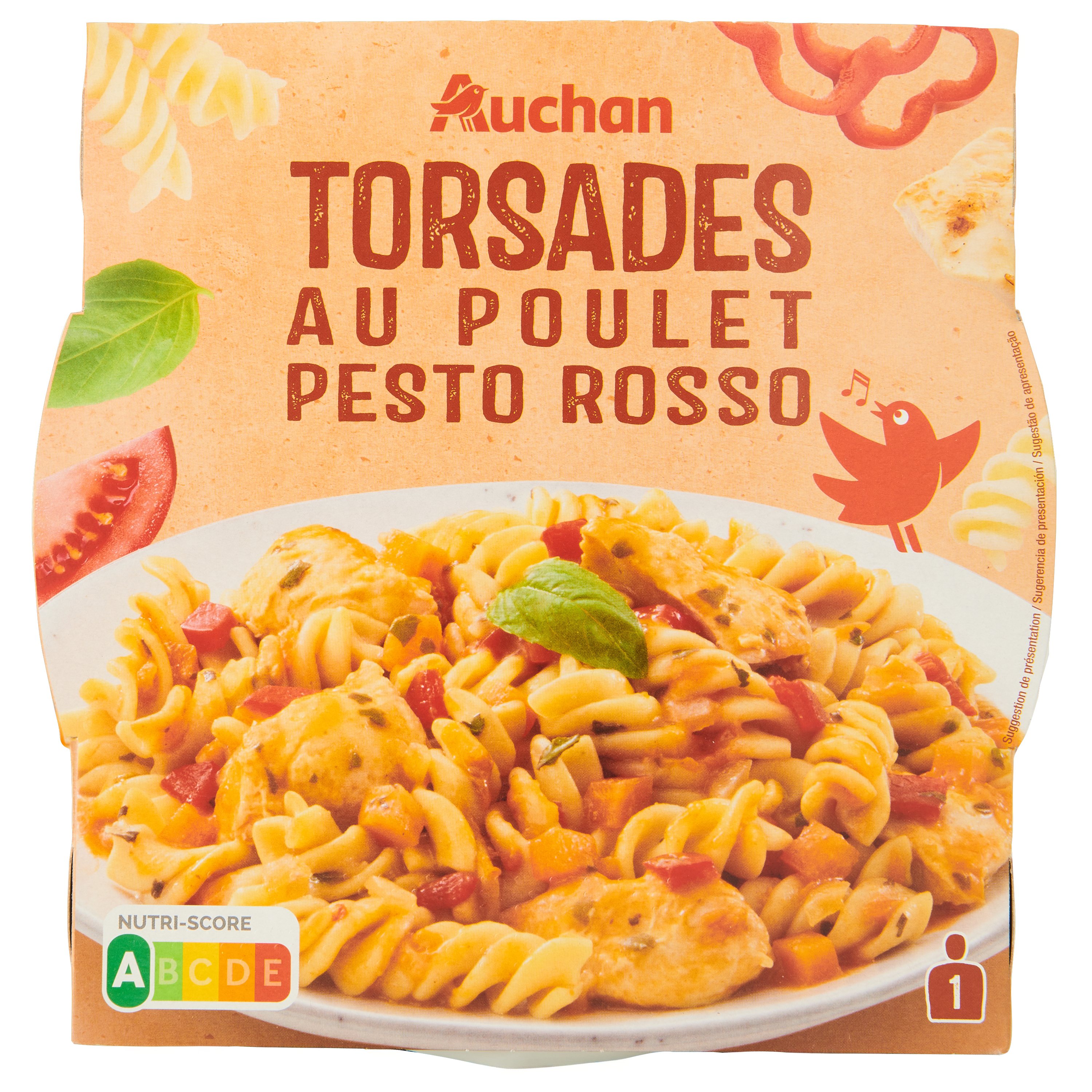 Plat composé de torsades (spécialités céréalières), viande de poulet traitée en salaison et précuite à la tomate, au parmesan et basilic, aromatisé.