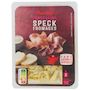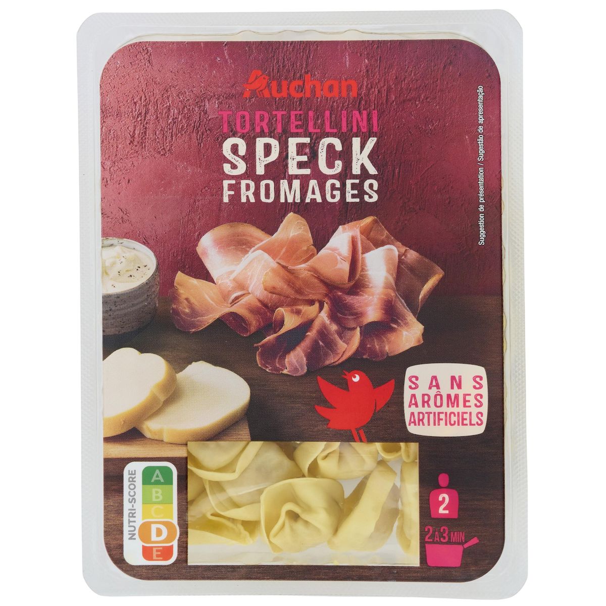 Ingrédients : Pate 55% : farine de BLÉ tendre, ŒUFS 16%, semoule de BLÉ dur. Farce 45% : Speck 9,0% (porc, sel, épices, herbes, dextrose, conservateur : nitrite de sodium antioxydant : ascorbate de sodium fumé avec du bois de banc), chapelure (farine de BLÉ, levure, sel), LAIT demi-écrémé, eau, fromage scamorza 4,5% (LAIT), huile de tournesol, flocon de pomme de terre, sauce au fromages [crème fraîche (LAIT), mozzarella 0,3% (LAIT), fromage râpé 0,3% (LAIT), eau, farine de riz, amidon de maïs, sel], beurre (LAIT), sel, fibres de BLÉ. Traces éventuelles de soja et moutarde. Élaboré à partir de lait origine UE. Pourcentages exprimés sur le total de la recette.