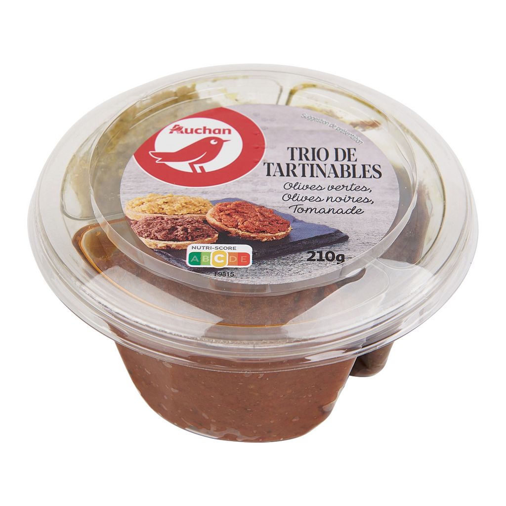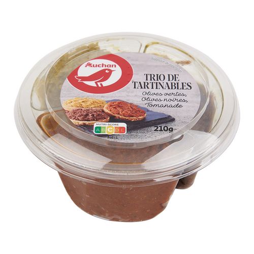 Tartinable à l'olive verte : olives vertes 77% (olives, sel), pâte de basilic (basilic 9,4%, huile d'olive vierge, sel), huile d'olive vierge, câpres au vinaigre 1,4% (câpres, vinaigre d'alcool, sel), ail, jus de citron à base de concentré, conservateur : acide sorbique, épaississants : gomme xanthane, gomme guar. Pourcentages exprimés sur le total de la recette. Tartinable à l'olive noire : préparation aux olives noires 27% (pâte d'olives noires 25%, sel, huile de tournesol), olives tournantes 27% (olives, sel), olives vertes 27% (olives, sel), pâte de basilic (basilic 9,9%, huile d'olive vierge, sel), huile d'olive vierge, câpres au vinaigre 1,7% (câpres, vinaigre d'alcool, sel), ail, jus de citron à base de concentré, conservateur : acide sorbique, épaississants : gomme xanthane, gomme guar. Pourcentages exprimés sur le total de la recette. Tartinable aux tomates séchées : tomates séchées 41% (tomates, sel), eau, huile de colza, pâte de basilic (basilic 8,9%, huile d'olive vierge, sel), câpres au vinaigre 2,2% (câpres, vinaigre d'alcool, sel), ail. Pourcentages exprimés sur le total de la recette.Traces de céleri, céréales contenant du gluten, crustacés, graines de sésame, moutarde, fruits à coque, lait, œufs, poissons, soja, sulfites, mollusque. Peut contenir des noyaux. Conditionné sous atmosphère protectrice.