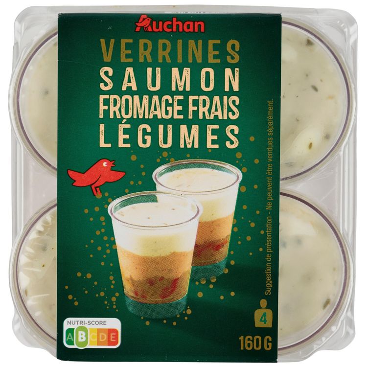 Ingrédients : Saumon Salmo salar (POISSON) 18,5%, LAIT entier 13% eau, huile de colza, courgette 8%, aubergine 4,5%, échalote 4,5%, fromage frais (LAIT) 4,5%, saumon fumé [ Salmo salar , sel (POISSON)] 4%,fromage (LAIT) 4%, poivrons 4%, huile d'olive, jus de citron, protéines de LAIT , fécule de manioc, purée de tomates double concentrée, ail, sel, persil, sucre, épaississant : gomme xanthane, zestes de citron, jus concentré de carottes, amidon de mais. Elaboré à partir de lait origine France (hors protéines de lait origine UE).Traces éventuelles de céleri, céréales contenant du gluten, crustacés, fruits à coques, lupin, mollusques, œufs, sésame, soja, sulfites.