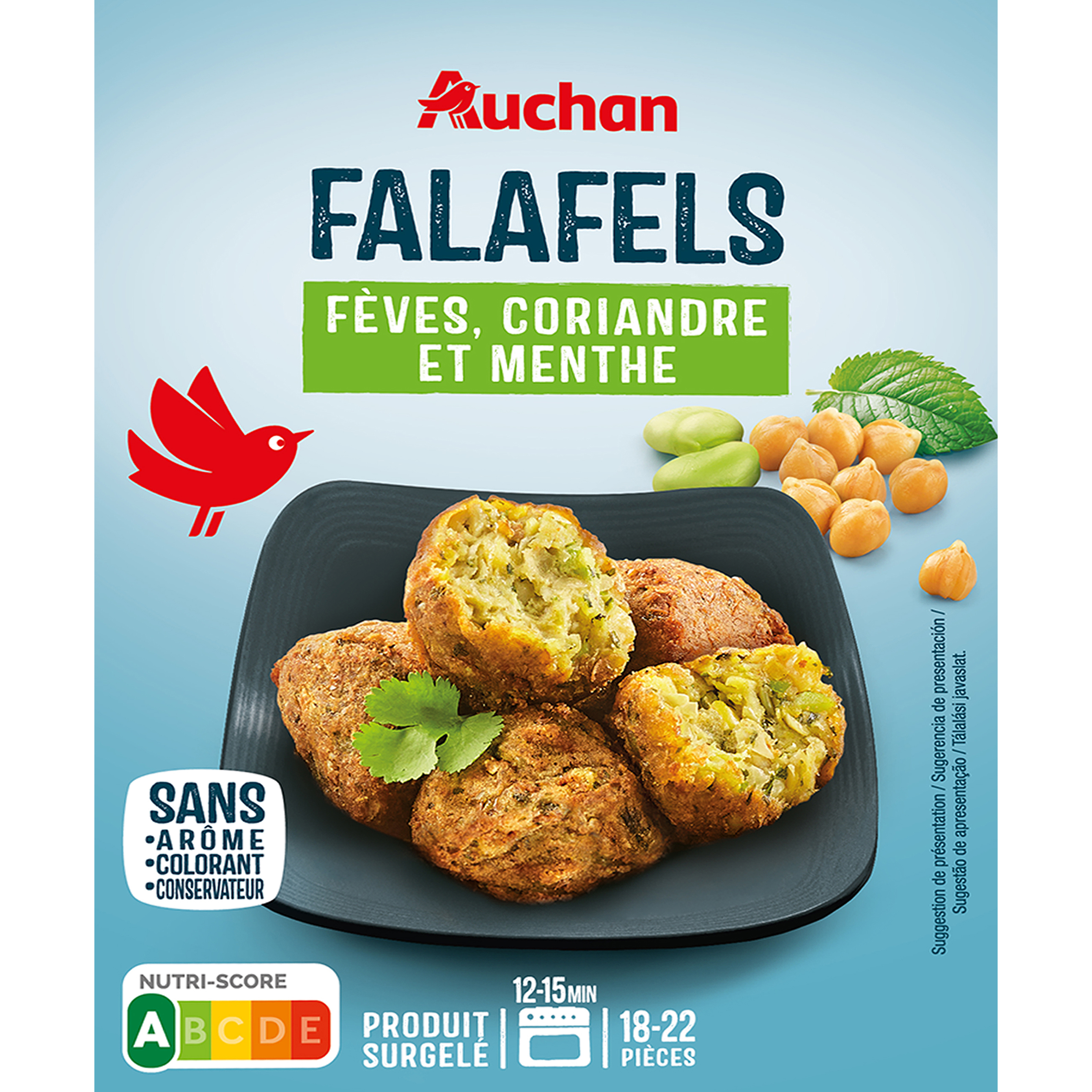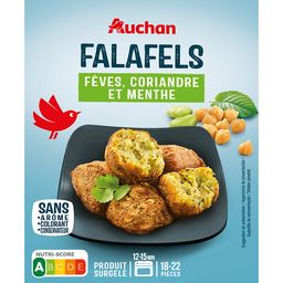 Ingrédients : Pois chiches précuits 47% (eau, pois chiches), fèves 15%, oignons préfrits (oignons, huile végétale (contient tournesol et/ou colza)), eau, huile d'olive vierge extra, huiles végétales (colza et tournesol en proportion variable), farine de BLÉ , coriandre 2%, persil 1%, sel, cumin, menthe douce 0.6%, ail déshydraté, épaississant : méthylcellulose, poivre noir. Traces éventuelles de lait, mollusques, œuf, poissons, soja, céleri .