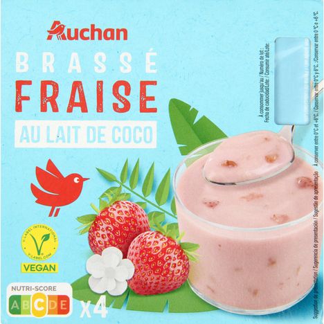 Ingrédients : eau, lait de coco 19% (eau, extrait de noix de coco 6,7%), fraise 13%, sucre 8,7%, amidon modifié de tapioca, amidon, jus concentré de citron, concentré de carotte pourpre, arômes naturels, sel, ferments, protéines de pois.