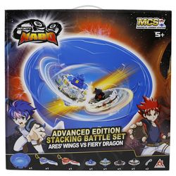 Ce Battle Set Infinity Nado est composé d'une arène de combat pour des affrontements impressionnants, 2 toupies empilables Ares Wings et Fiery Dragon avec leurs anneaux empilables en métal, 2 lanceurs magnétiques pour lancer les toupies dans l'arène à pleine puissance, et 1 outil d’assemblage