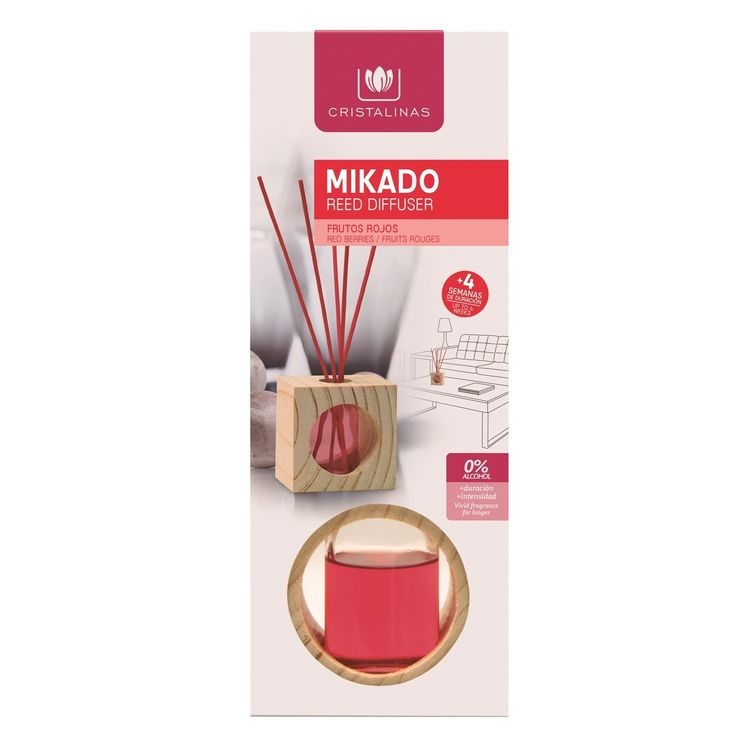 DIFFUSEUR DE PARFUM DÉCORATIF CUBE BOIS BATONNETS FRUITS ROUGES 30 ML - 0 % alcool - Aux huiles essentielles. Diffusion douce et constante avec une intensité préservée pendant 30 jours grâce à sa formule 0% alcool.