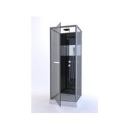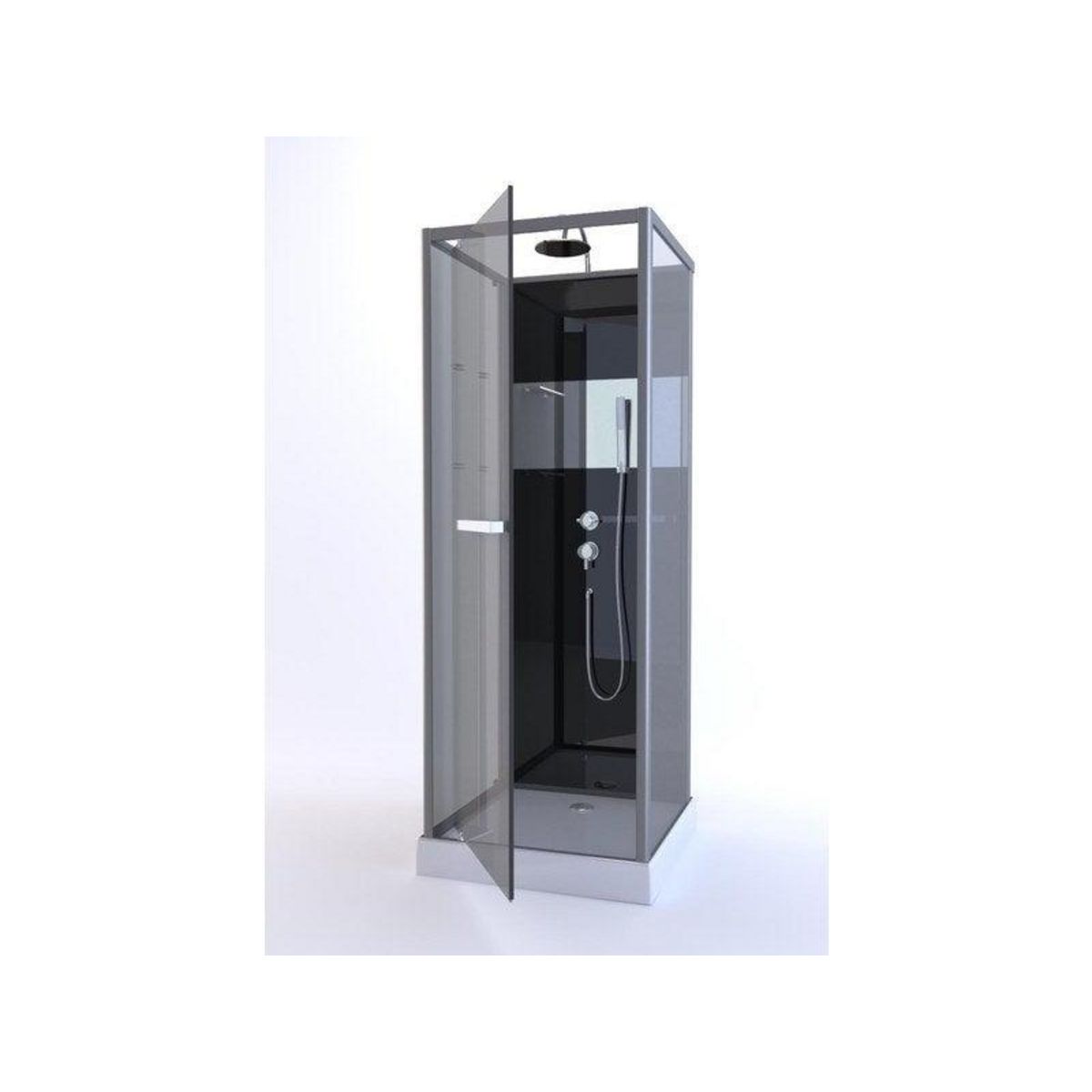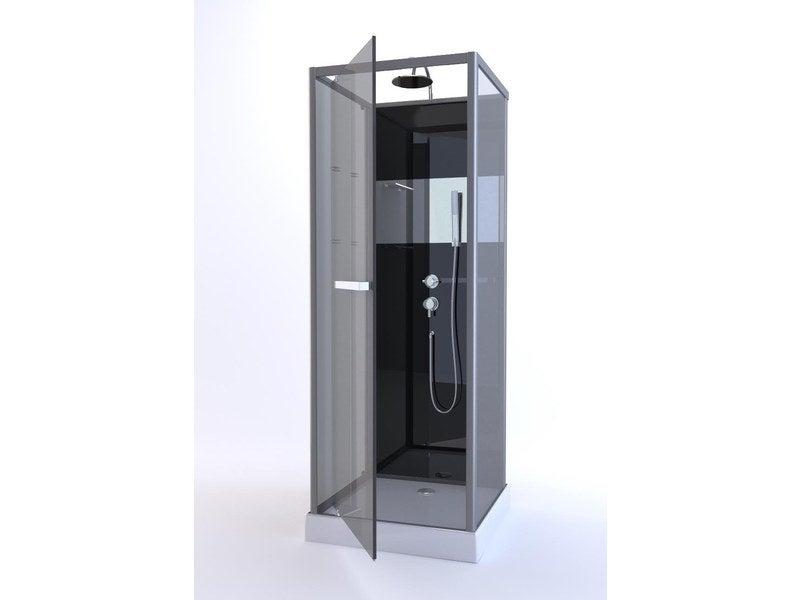 Type de douche : SimpleAccès à la douche : FaceType de porte : PivotantLongueur (en cm) : 90Largeur (en cm) : 90Hauteur (en cm) : 225Largeur de passage (en cm) : 55Poids de la cabine (en kg) : 80Coloris des profilés : Aluminium laqué grisColoris des parois de fond : NoirMatière des parois de fond :