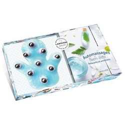 Un magnifique gant de massage en silicone, flexible, de qualité supérieure : muni de 9 billes rotatives en Inox®, et parfaitement adaptable à toutes les mains, il permet de libérer toutes les tensions du corps (dos, nuque, épaules, jambes...). Il est également idéal pour la réflexologie et le massage des zones réflexes. Utilisé de façon régulière, il permet une meilleure circulation sanguine. Il lutte aussi efficacement contre la cellulite (cuisses). Un livre de 96 pages montrant 50 mini-séances d'automassages faciles et rapides pour se détendre et se soigner, à la maison, au bureau, en voiture... Apaisants, relaxants, ou énergisants, ces gestes sont illustrés pas à pas, pour se faire du bien sur toutes les parties du corps, de la tête aux pieds.