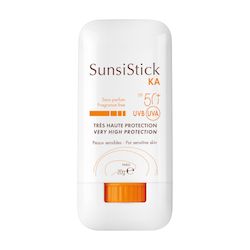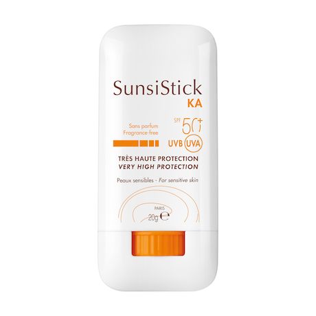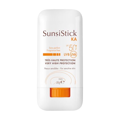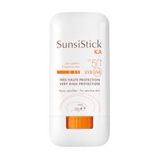 SunsiStick KA SPF 50+ s'emploie sur les zones localisées du front, du nez, des pommettes, du crâne, du dos des mains... Il offre une très haute protection solaire quotidienne aux peaux sensibles, à risque, et sujettes aux kératoses actiniques. Sa formule au fini transparent s'applique très facilement, même sur les zones les plus sensibles. Au coeur de SunsiStick KA SPF 50+, un complexe d'actifs unique, issu de la Recherche Pierre Fabre et composé : - D'un système filtrant stable et efficace dans le temps pour une très large protection UVB-UVA. - D'un duo d'antioxydants complémentaires : Thialdine pour protection cellulaire immédiate + Provitamine E (Pré-tocophéryl) pour une protection cellulaire globale contre le stress oxydatif. - De Vederine™, actif permettant d'augmenter l'expression des récepteurs de la vitamine D et de renforcer la barrière cutanée. Sa très haute tolérance cutanée a été démontrée et évaluée sous contrôle dermatologique. Rémanence longue durée*. *Etude de la rémanence sur 8 heures après application unique, 20 personnes.
