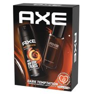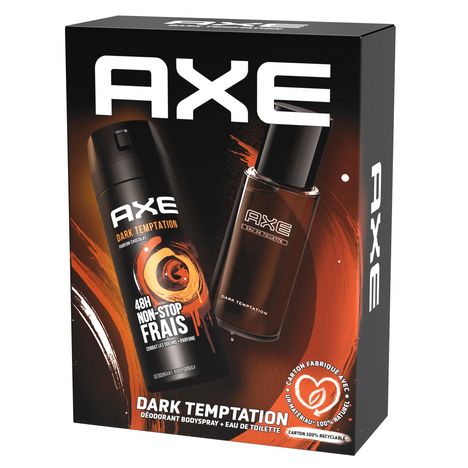 Le coffret cadeau AXE Dark Temptation est composé de 2 produits homme pour sentir bon toute la journée : un déodorant bodyspray de 200 ml et une eau de toilette de 100 ml.