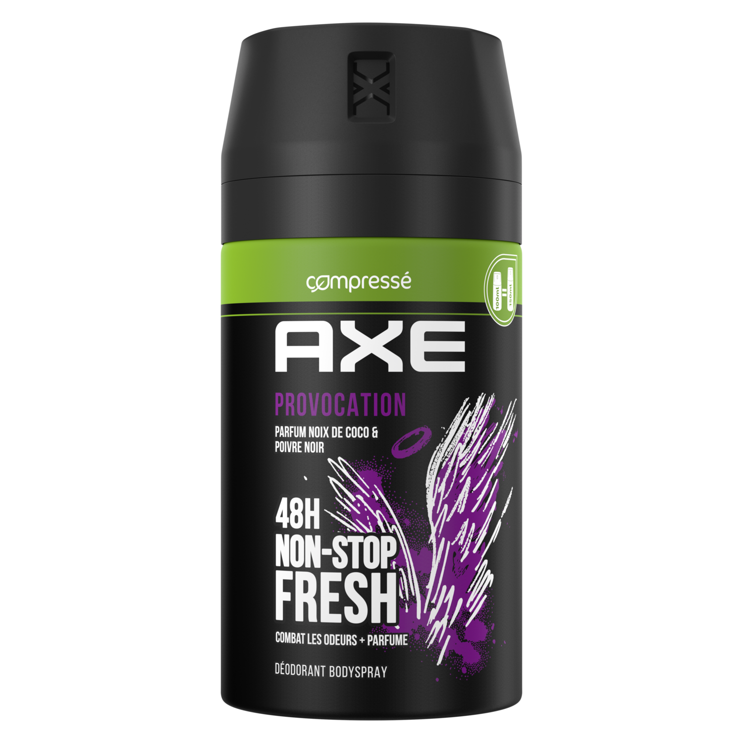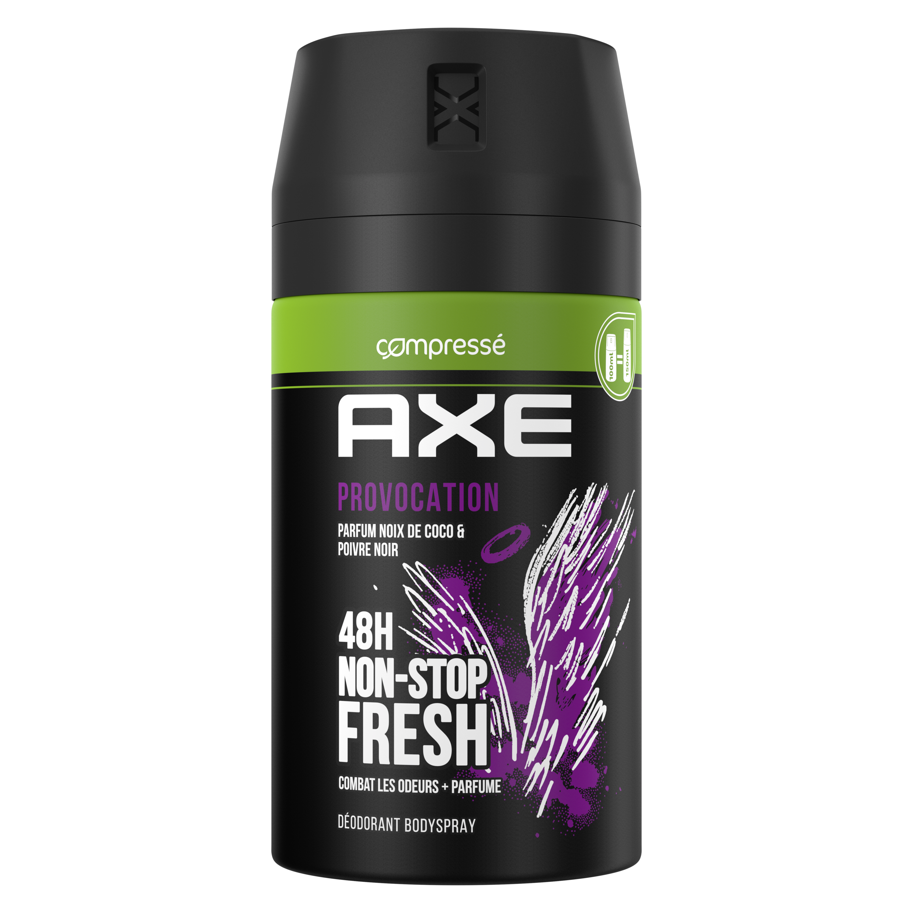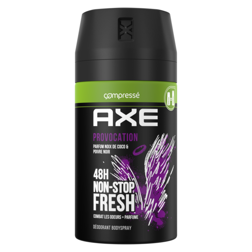 Bienvenue dans le futur, ça sent incroyablement bon ! Reste frais et sens irrésistiblement bon avec le déodorant homme spray AXE Provocation. Sa technologie Dual Action™ combat les odeurs tout en libérant un parfum ultra-frais de noix de coco et de poivre noir. Efficace pendant 48 h, le déo AXE Provocation te permet de rester confiant toute la journée. Son format compressé 100 ml est ultra-pratique et s'emporte partout. Secoue, tourne et vaporise le déodorant à 15 cm du corps ou des aisselles. En plus, il est composé d'aluminium 100% recyclable à l'infini, alors recycle-le ! D'ici 2025, AXE s'engage à ce que ses emballages soient recyclables ou contiennent des matériaux recyclés. Tu aimes le parfum de ce déodorant ? AXE Provocation existe aussi en gel douche pour encore plus de fraîcheur.