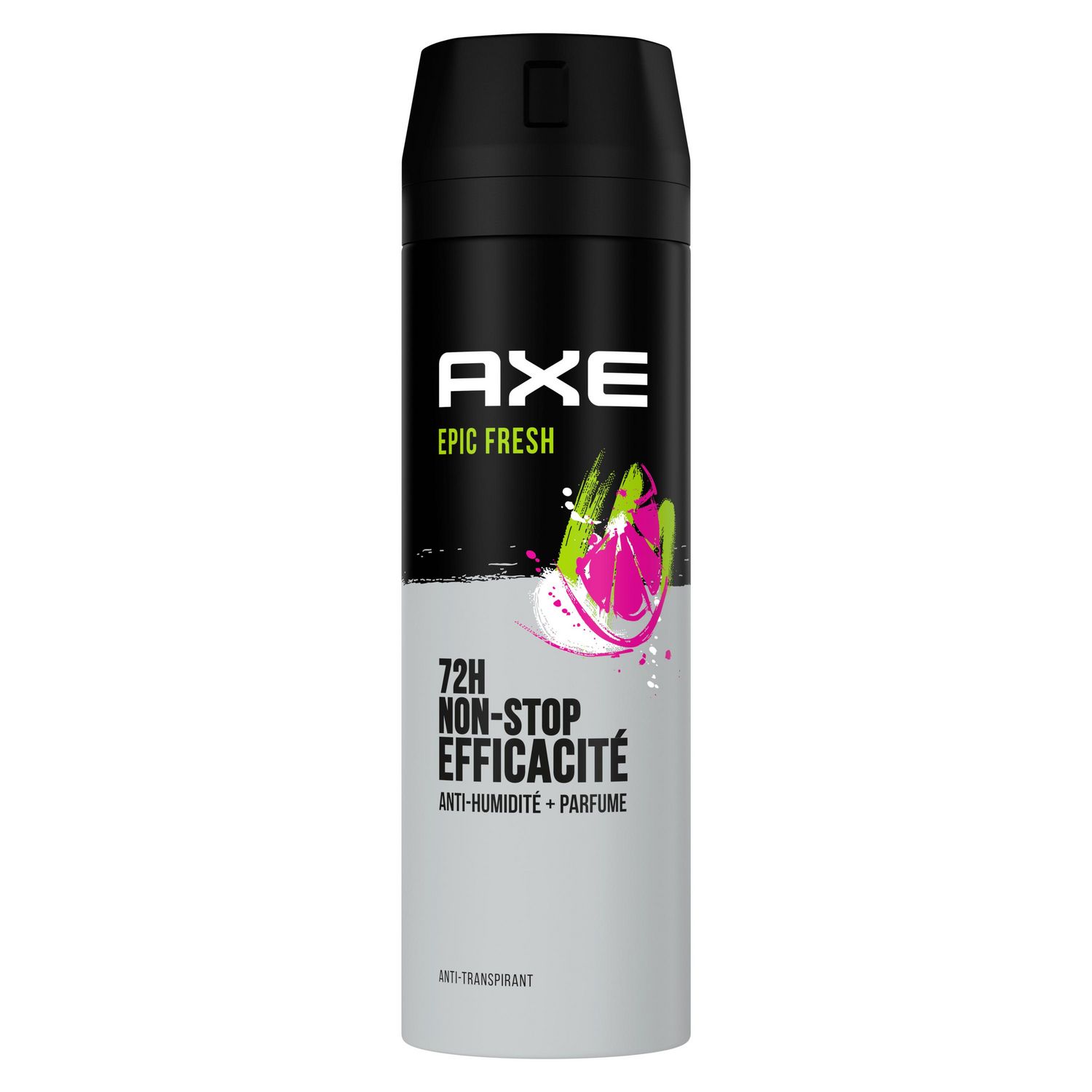 Bienvenue dans le futur, ça sent incroyablement bon ! Reste frais et sens irrésistiblement bon avec le nouvel anti-transpirant homme AXE Epic Fresh, au format 200 ml. Sa nouvelle technologie combat la transpiration et les odeurs tout en libérant un parfum ultra-frais d'ananas tropical et de pamplemousse. Grâce à sa formule haute efficacité anti-humidité de 72 h, l'anti-transpirant AXE te permet de rester confiant toute la journée. En plus, il est en aluminium 100 % recyclable à l'infini, alors recycle-le ! D'ici à 2025, AXE s'engage à ce que ses emballages soient recyclables ou contiennent des matériaux recyclés. Tu aimes le parfum de cet anti-transpirant ? AXE Epic Fresh existe aussi en gel douche pour encore plus de fraîcheur. Depuis 1983, la marque AXE accompagne les hommes au quotidien avec sa gamme complète de soins d'hygiène : déodorants, anti-transpirants, gels douche, shampoings, produits coiffants, baumes après-rasage, eaux de toilette et parfums. Tout ce dont un homme a besoin pour affirmer son style et rester confiant tout au long de la journée, car ce qui rend un homme attirant, c'est avant tout son propre style ! Nos produits ont une fragrance sensuelle aux notes sophistiquées, ce qui te permet de rester frais, confiant et de sentir bon, même lors des coups de chaud du quotidien. Retrouve-nous vite sur les réseaux. Au programme : de l'humour, de la musique, du gaming et de nombreuses surprises !