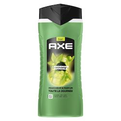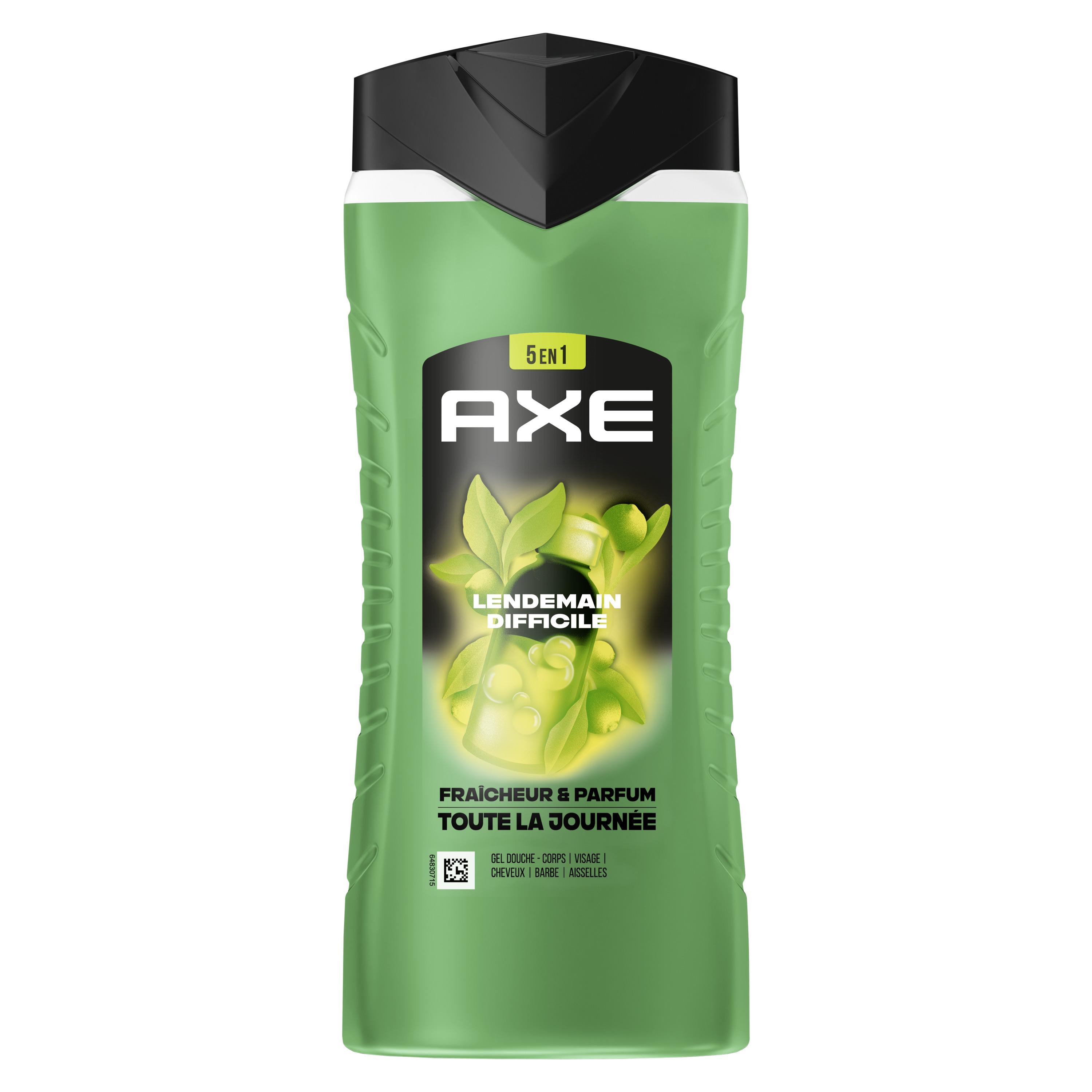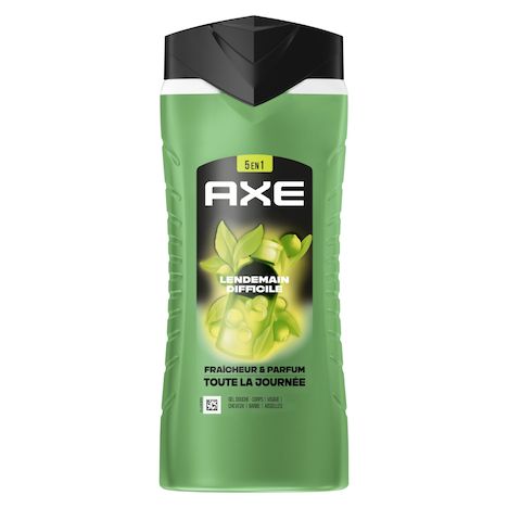 Bienvenue dans le futur, ça sent incroyablement bon ! Sens-toi propre et frais et sens irrésistiblement bon pour plus longtemps avec le nouveau gel douche homme 5-en-1 AXE Lendemain Difficile au format 400 ml. Sa formule testée dermatologiquement et composée à 87 % d'ingrédients d'origine naturelle combat les odeurs et assure 24 h d'hydratation. Au pH neutre, elle élimine les bactéries responsables des mauvaises odeurs et offre fraîcheur et parfum toute la journée, tout en respectant la peau des hommes. Cette nouvelle formule est certifiée Peta, ce qui signifie qu'aucun test n'est fait sur les animaux dans le monde entier. Ce gel douche AXE libère un parfum frais d'agrumes pour un effet incroyablement addictif. En plus, sa bouteille est majoritairement recyclable. Dépose-la dans le bac de tri ! Depuis 1983, la marque AXE, N°1 des déodorants en France*, accompagne les hommes au quotidien avec sa gamme complète de soins d'hygiène : déodorants, anti-transpirants, gels douche et eaux de toilette. Tout ce dont un homme a besoin pour affirmer son style et rester confiant tout au long de la journée. Car ce qui rend un homme attirant, c'est avant tout son propre style ! Nos produits ont une fragrance sensuelle aux notes sophistiquées, ce qui te permet de rester frais, confiant et de sentir bon, même lors des coups de chaud du quotidien. *CAM P9 2024 en ventes valeurs HMSM.