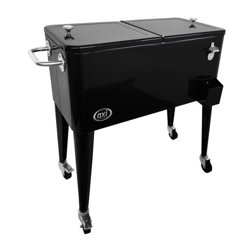 La glacière AXI Rétro Cooker Black sera votre meilleur allié durant les fêtes ou bien encore les barbecues cet été ! Elle est d'apparence très élégante et possède un design rétro qui ne vous laissera pas indifférent. Constitué de 4 roulettes pour la déplacer avec une grande facilité, elle mesure 87 cm de hauteur pour vous octroyer un confort supplémentaire qui vous évitera de vous baisser pour prendre vos boissons fraiches. La glacière peut être stabilisée grâce au frein sur deux roues, les boissons et nourritures froides peuvent être conservés pendant une durée de 36 heures ! La glacière peut être ouverte des deux côtés ou en intégralité, un ouvre bouteille est fixé à l'avant permettant d'ouvrir vos bouteilles d'un seul geste. La capacité est d'environ 76 litres et peut supporter un poids de 55 kg maximum, place suffisante pour accueillir au moins 70 canettes ou 50 bouteilles. La glacière est faite en métal recouverte de peinture noir et l'intérieur en plastique polypropylène.