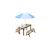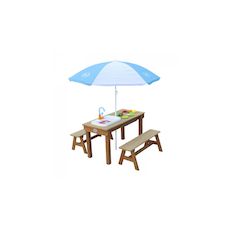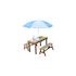 AXI Dennis Table sable et eau Picnic avec cuisine evier et banc Marron Parasol Bleu Blanc