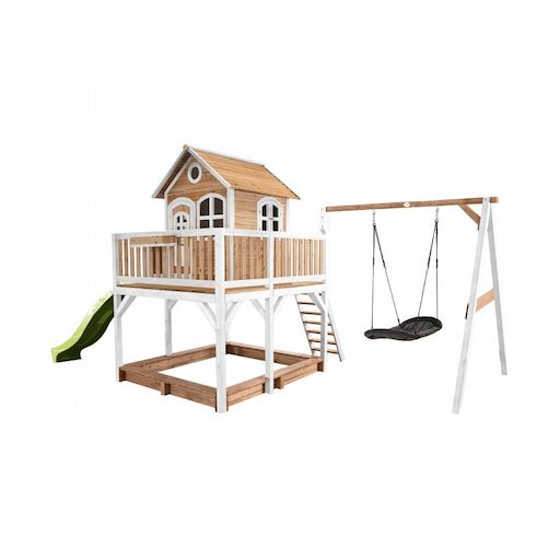 Axi Maisonnette LIAM Brun Blanc avec balancoire nid ovale Roxy toboggan Citron vert et bac à sable