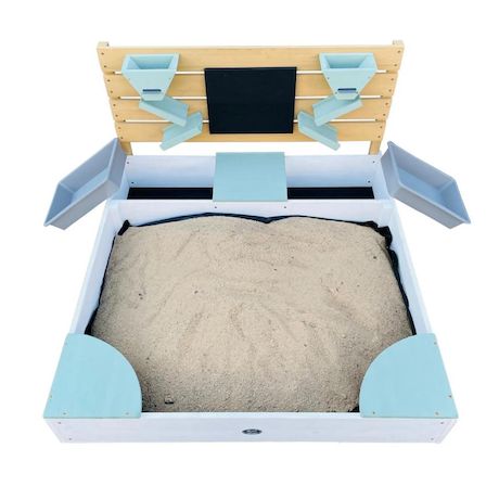 Contient : Bac à sable Cato ardoise vert/blanc/marron Caractéristiques Grand bac à sable en bois d'une capacité d'environ 110 kg de sable. Mur de jeu avec 2 entonnoirs en bois permettant à votre enfant de verser le sable. Tableau noir sur le mur de jeu pour stimuler la créativité des enfants (crayon