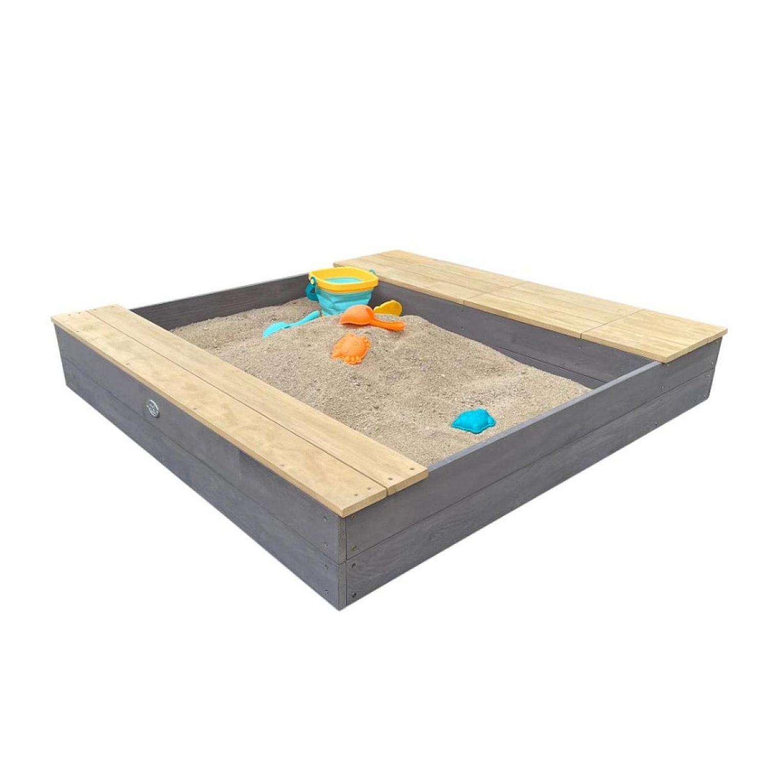 Contient : Bac à sable Evy avec bacs rangement gris/marron Grand bac à sable en bois d'une capacité d'environ 100 kg de sable de jeu. Comprend un couvercle et une toile de fond pour garder le sable de jeu propre et en sécurité. Deux bacs en plastique gris amovibles pour le sable ou l'eau. Maximum 3