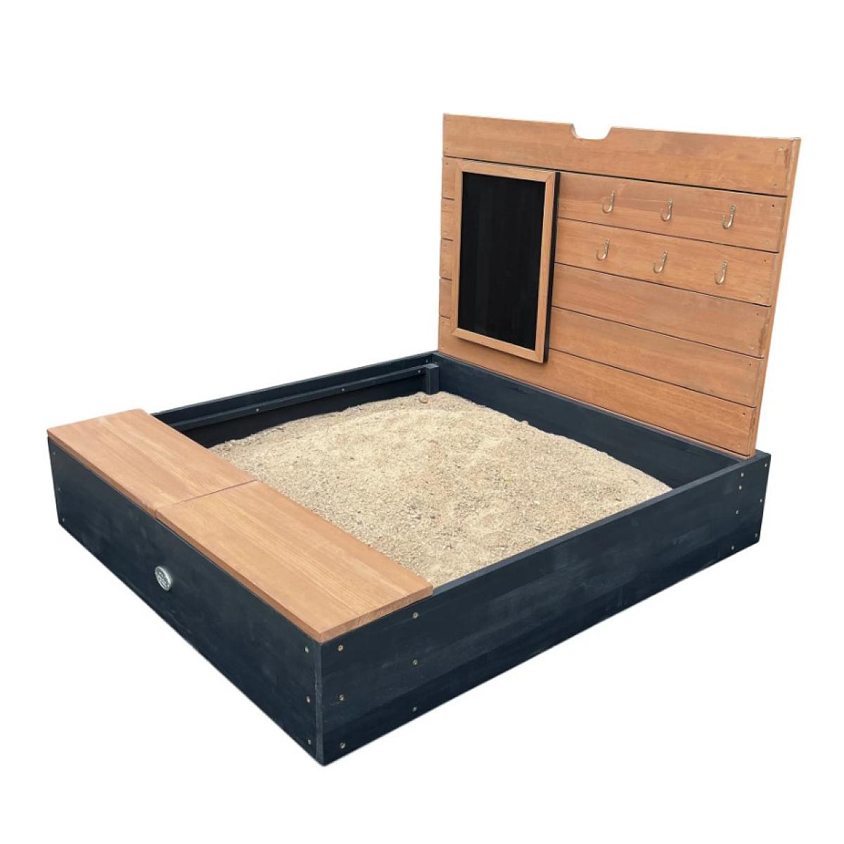 Contient : Bac à sable Mandy rangement + couvercle anthr./marron Dimensions (L x l x H) : 100 x 90 x 74 cm. Dimensions plié (L x l x H) : 100 x 90 x 18 cm. Largeur du banc : 18 cm. Grand bac à sable en bois d'une capacité d'environ 100 kg de sable de jeu. Avec tableau noir et 6 crochets. Refermez le
