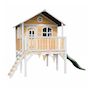 Contient : Maisonnette Sophie marron/blanc toboggan vert Dimensions extérieures (L x l x H) : 212 x 380 x 274 cm Dimensions intérieures (L x l x H) : 175 x 113 x 120-174 cm Hauteur du plateau : 98 cm Dimensions de la porte (l x H) : 44 x 99 cm