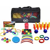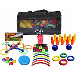 Contient : Sac d'activités enfant Votre enfant pourra travailler sa concentration, son corps, son langage, ses mathématiques, mais aussi s'amuser à lancer, attraper et courir. Large choix de jeux et d'activités lancer d'anneaux. Poufs éducatifs en forme de scarabée. Apprendre activement à compter avec 15 poufs colorés. Anneaux en caoutchouc (Tennikoit). Hula-hoop. Frisbee. Bowling.