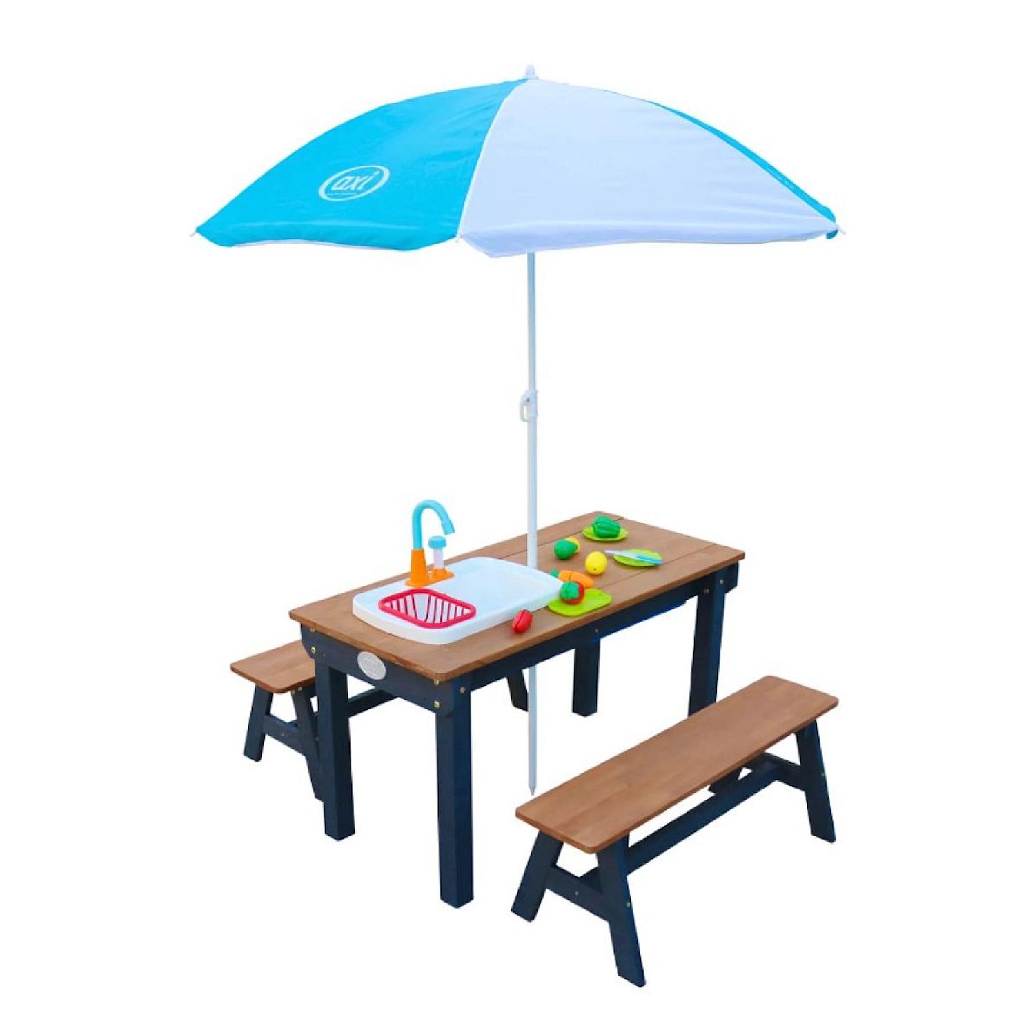 Contient : Table pique-nique eau+sable Dennis + évier Table de pique-nique sable et eau multifonctionnelle avec évier Play Kitchen. Récipient en plastique amovible pour le sable ou l'eau pouvant contenir jusqu'à 8 litres. Évier remplissable avec robinet de fonctionnement pouvant contenir environ 4 L d'eau (non inclus). Inclus un ensemble d'accessoires de 17 pièces comprenant 2 assiettes, une grille, une planche à découper, un couteau et 6 morceaux de fruits et légumes en deux parties. Poids maximal : 100 kg par banc. FSC 100% bois de pruche, provenant de forêts gérées durablement. La pruche ne se fend pas et est naturellement résistante aux intempéries telles que la pluie et donc résistante à la pourriture du bois. Assemblage facile grâce à des pièces partiellement préassemblées. Traité avec une teinture à base d'eau, sans produits chimiques. Adapté aux enfants de 3 à 10 ans.