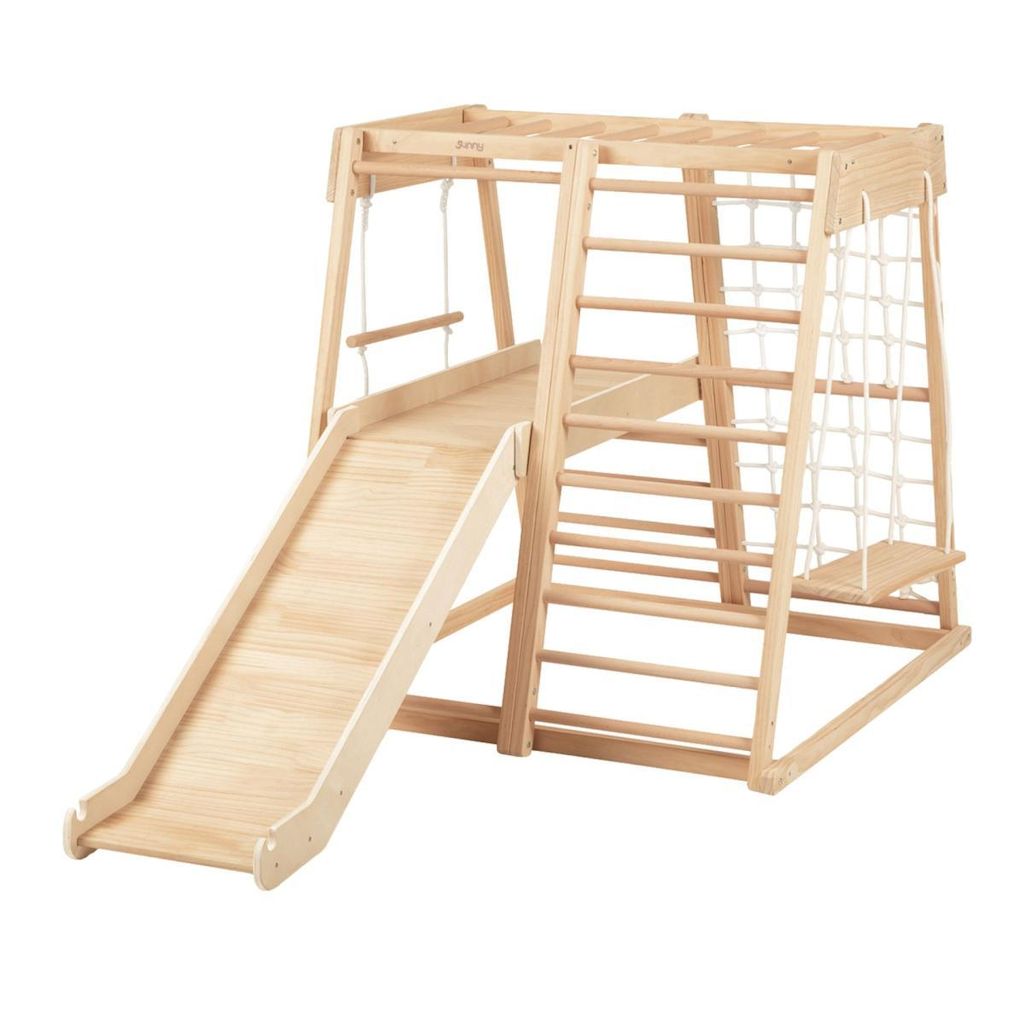 Contient : Tour descalade Mickie naturel Caractéristiques Tour d'escalade en bois Sunny Mickie avec toboggan et balançoire, coloris naturel. Convient aux enfants dès 1 an sous la surveillance d'un adulte. Charge maximale : 80 kg. Convient à 2 enfants simultanément. Idéal pour une utilisation en intérieur. Inspiré des principes Montessori. Montage facile en 60 minutes environ. Poids : 26 kg. Fabriqué en bois issu de forêts gérées durablement (certifié FSC Mix). Conforme à la norme de sécurité EN71. Garantie 2 ans. Dimensions (L x l x H) : 200 x 106 x 123 mm