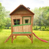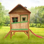 Cette jolie maison robuste et toute biscornue procurera des heures de joie à vos enfants. Montée sur pilotis, elle possède un toboggan et une terrasse avec balustrade. Réalisée en bois imputrescible, elle ne nécessite pas d'entretien et est déjà peinte. Toit en bois imperméable avec cheminée, fenêtres en plexiglas (trois fenêtres ouvrantes: une sur chaque coté et une derrière). Fenêtres et porte avec fermeture aimantée.