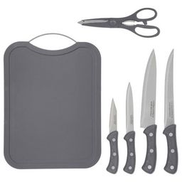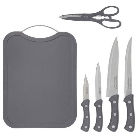 Informations Techniques : Dimensions : Planche à découper : L. 35 x l. 25 x H. 2,5 cm Couteau 1 : L. 31,5 x l. 3,5 x ép. 2 cm Couteau 2 : L. 18,8 x l. 2,8 x ép. 1,5 cm Couteau 3 : L. 23 x l. 3 x ép. 1,8 cm Couteau 4 : L. 31,6 x l. 4,5 x ép. 2 cm Ciseaux : L. 21 x l. 7,6 x ép. 1,3 cm Matière : Polypr