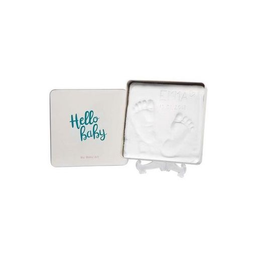 La boîte métallique blanche au motif Hello Baby offre un écrin raffiné pour exposer ces précieuses empreintes. Son format carré moderne s'intègre parfaitement dans toute décoration d'intérieur, tandis que le petit support inclus permet une mise en valeur élégante dans la chambre de bébé.