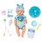 1 poupon, 11 accessoires (1 certificat de naissance, 2 bracelets, 1 biberon, 1 tétine, 1 couche, 1 assiette, 1 cuillère, 1 pot, 1 attache tétine, de la nourriture)