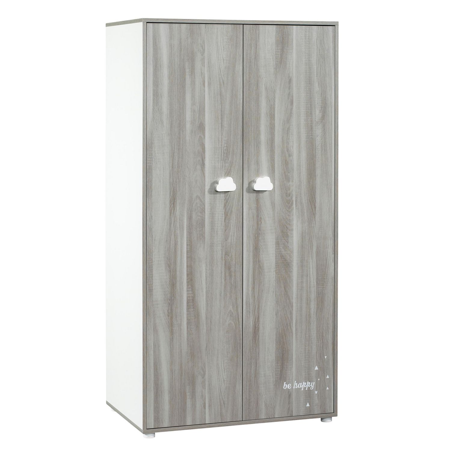 Laissez-vous séduire par l'armoire 2 portes HAPPY et sa finition chêne silex. L'armoire est conçue avec 3 tablettes intérieures mobiles et une barre de penderie pour ranger facilement toutes les affaires de l'enfant. Les portes sont équipées de poignées en forme de nuage. Avec son design sobre et él