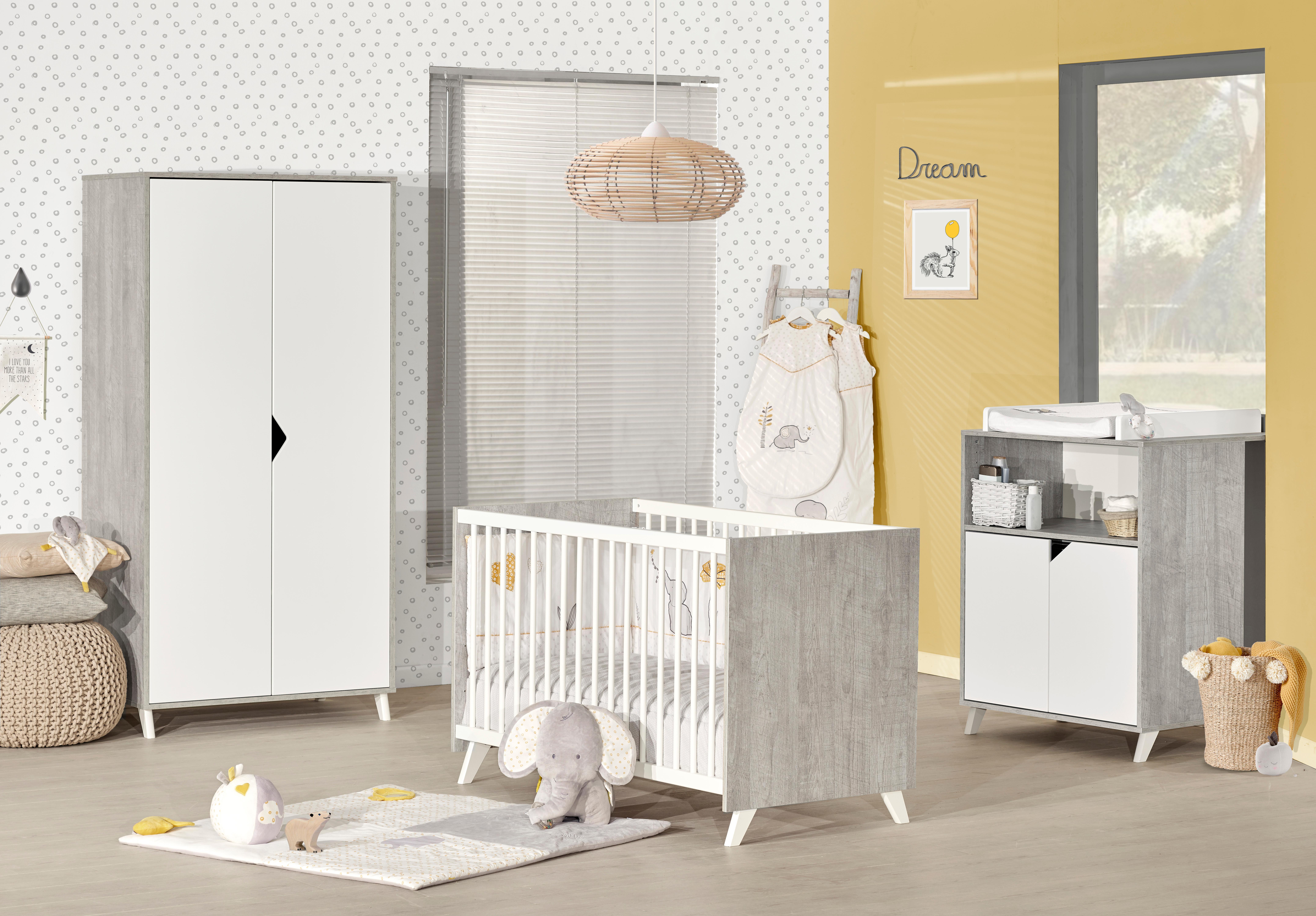 Pour une chambre bébé moderne et de qualité, aménagez la chambre de votre tout petit avec les meubles pour bébé de la collection SCANDI ! Cet ensemble de chambre complète au style scandinave est composé d'un lit bébé à barreaux ronds couchage 60x120cm avec sommier en hêtre brut réglable sur 3 positions, une commode avec dispositif à langer muni de 2 portes et d'une grande niche, ainsi qu'une grande armoire 2 portes disposant de 3 étagères et d'une grande tringle penderie pour ranger tout le nécessaire de bébé. Cette jolie chambre bébé complète de la gamme SCANDI de coloris gris loft/laqué blanc apportera un look nordique stylisé à la chambre de votre petit bout, et lui procurera de belles et longues nuits de sommeil dans une atmosphère apaisante. Munissez vous sans plus tarder de cette collection de meubles pour bébé avec de nombreux rangements, qui vous permettra de prendre soin de votre bébé et cela en toute sécurité.