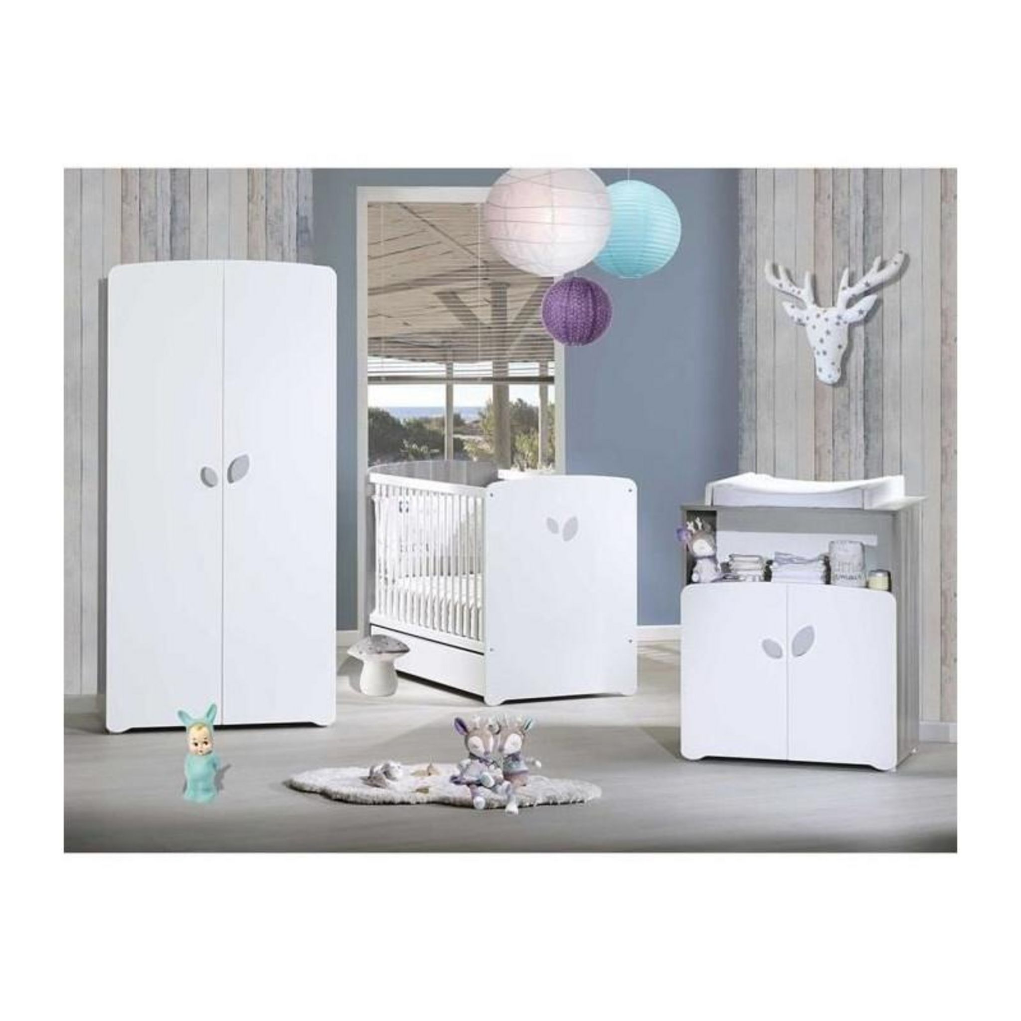 Le lit 120x60 cm dispose d'un sommier réglable en 3 positions pour s'adapter à la croissance de l'enfant. La commode à langer 2 tiroirs intègre une niche sécurisée, tandis que l'armoire 2 portes offre un rangement généreux pour les affaires de bébé. Un gain de place intelligent grâce à des dimensions étudiées.