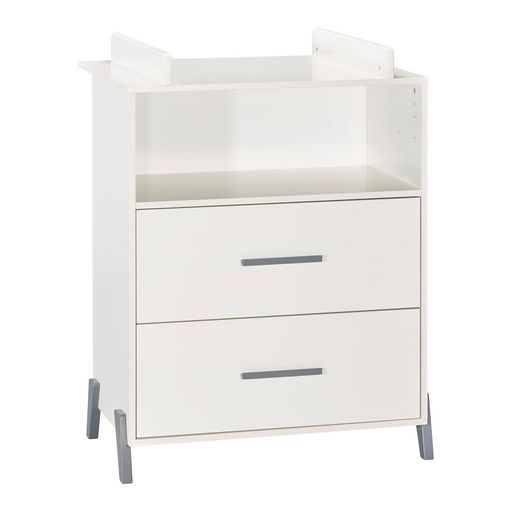 Élément phare d'ameublement pour bébé, cette commode à langer blanche 2 tiroirs et 1 niche de la collection JOY est idéale pour changer en toute sécurité votre petit bout. Disposant de 4 pieds biseautés et de 2 poignées en hêtre laqués gris foncé, elle propose un look coloré et nordique qui saura parfaitement s'adapter à une décoration sobre, ludique et moderne. La commode à langer JOY de style scandinave est une commode qui combine modernité et fonctionnalité. Elle possède 2 grands tiroirs et une grande niche pour vous permettre de ranger l'essentiel des affaires de bébé. Vous pourrez ainsi changer bébé en toute sécurité jusqu'à ses 11 kg en ayant l'essentiel à portée de main. Une commode à langer de qualité et de fabrication française qui accueillera facilement bébé pendant de longs moments. Pour une chambre complète, vous pourrez associer à votre commode, les lits 120x60 ou 140x70 et l'armoire 2 portes de la collection JOY.