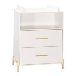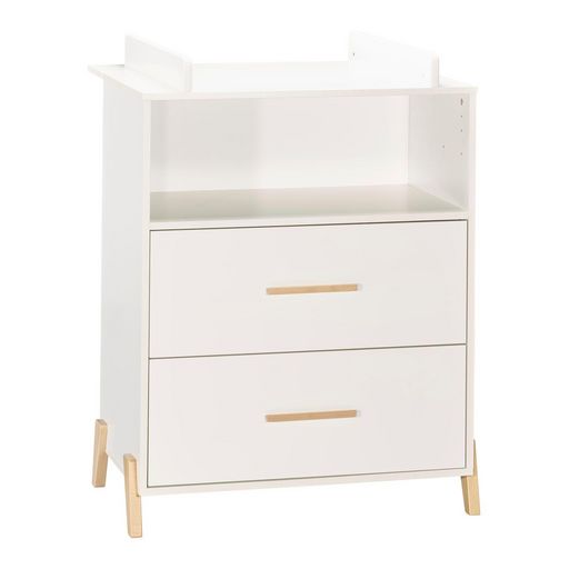 Élément phare d'ameublement pour bébé, cette commode à langer blanche 2 tiroirs et 1 niche de la collection JOY est idéale pour changer en toute sécurité votre petit bout. Disposant de 4 pieds biseautés et de 2 poignées en hêtre vernis naturel, elle propose un look épuré et nordique qui saura parfaitement s'adapter à une décoration boisée, ludique et moderne. La commode à langer JOY de style scandinave est une commode qui combine modernité et fonctionnalité. Elle possède 2 grands tiroirs et une grande niche pour vous permettre de ranger l'essentiel des affaires de bébé. Vous pourrez ainsi changer bébé en toute sécurité jusqu'à ses 11 kg en ayant l'essentiel à portée de main. Une commode à langer de qualité et de fabrication française alliant praticité et rangements, qui permettra de faire la toilette de bébé en toute sécurité. Pour une chambre complète, vous pourrez associer à votre commode, les lits 120x60 ou 140x70 et l'armoire 2 portes JOY.