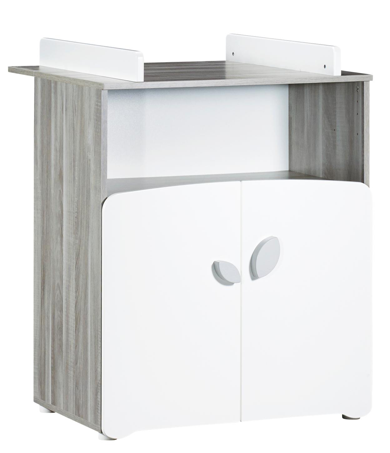 La commode CALINOU dispose d'un dispositif à langer amovible pour vous occupez de votre bébé et peut donc se retirer quand vous n'en n'aurez plus besoin. Avec ses 2 tiroirs et sa grande niche vous disposerez d'un espace de rangement suffisant pour ranger les affaires de votre bébé. De fabrication française, les matériaux utilisés sont : Panneau de fibres de moyenne densité (MDF) laqué blanc / Panneau de particules décor papier chêne silex / Panneau de fibres dures blanc / 2 boutons "feuille" (1 petit + 1 grand) laqués gris fumé. Cette commode CALINOU est garantie sans solvant et est conforme à la norme NF EN 12221 n°1 & 2 (2008) + A1 Octobre 2013. Elle offre donc toutes les garanties en terme de sécurité pour votre bébé. Pas encore convaincu par cette belle commode ? Ne vous inquiétez pas vous trouverez votre bonheur parmi les autres collections de chambre bébé sur Auchan.fr