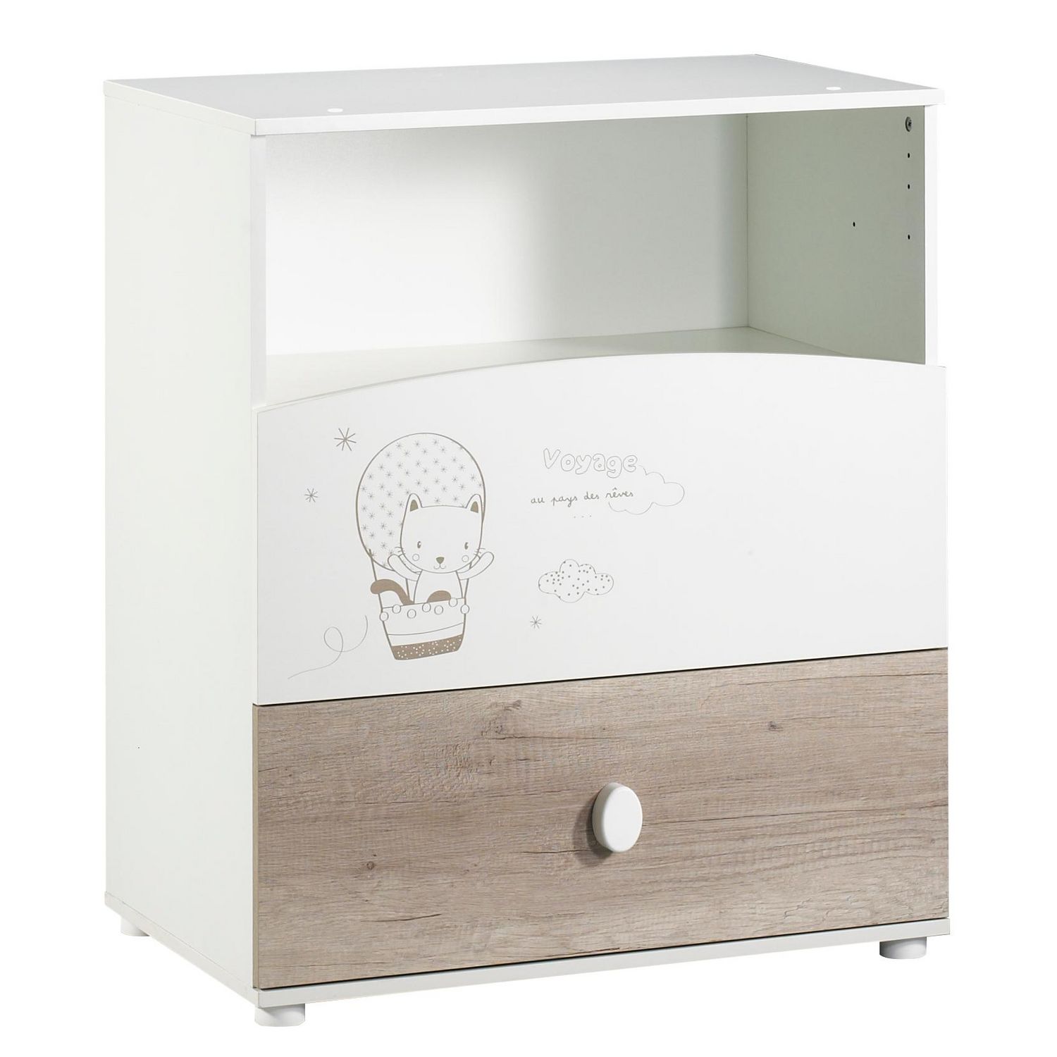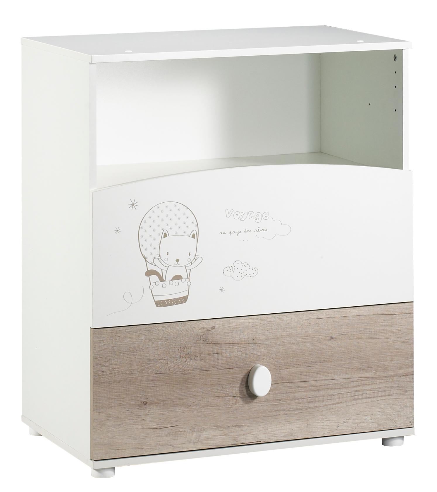 Commode à langer pour bébé très pratique avec 2 tiroirs et 1 niche de rangement. Dispositif à langer "amovible". Se transforme en commode simple en un clin d’œil. Coloris décor chêne et mélaminé blanc avec motifs chatons en montgolfière. Poignée ovale blanche. Structure en panneaux de particules. Fabrication française. Le meuble parfait pour ranger les affaires de bébé.