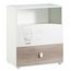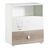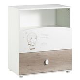 Face tiroir bas en panneaux de particules revêtus papier décor chêne coton. Face tiroir haut en panneaux de particules mélaminés décor blanc. Dessus, et plateau arrière du dispositif à langer, côtés, dessous et tablette niche en panneaux de particules mélaminés décor blanc. Joues du dispositif à langer en panneaux de fibres de moyenne densité (MDF) laquées blanc. 1 bouton ovale en panneaux de fibres (MDF) laqué blanc. 4 pieds ronds plastique blanc, Ht=25. Motif sérigraphié 1 couleur sur la face tiroir haut.
