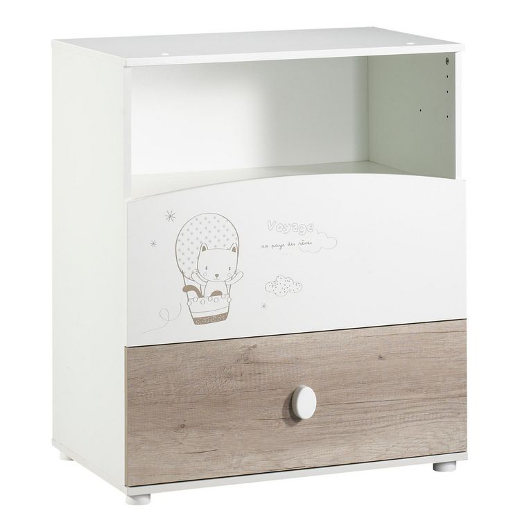 Commode à langer pour bébé très pratique avec 2 tiroirs et 1 niche de rangement. Dispositif à langer "amovible". Se transforme en commode simple en un clin d’œil. Coloris décor chêne et mélaminé blanc avec motifs chatons en montgolfière. Poignée ovale blanche. Structure en panneaux de pa