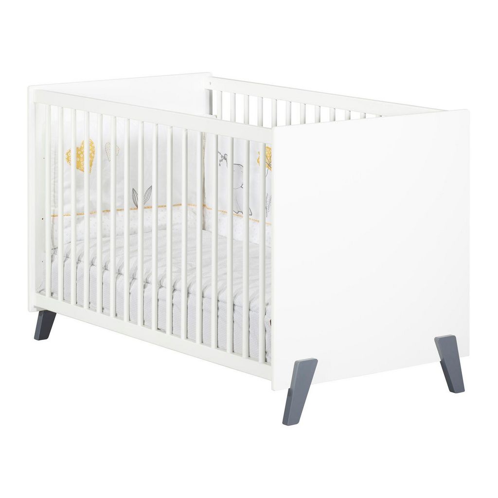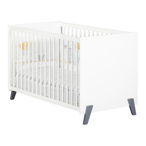 Lit bébé JOY de couchage 120x60cm avec pieds gris et sommier réglable sur 3 niveaux. Design et confortable, le lit bébé JOY de fabrication française est très pratique grâce à son sommier en hêtre brut réglable sur 3 hauteurs. Il est muni de 2 côtés fixes en hêtre à balustres ronds laquées blanc avec 4 pieds en hêtre laqués gris foncé. Le lit bébé de la collection Joy est un lit bébé coloré au look nordique et moderne, il sera parfait pour aménager la chambre de votre enfant et lui offrir de belles nuits de sommeil. Pour une chambre complète, vous pourrez associer à votre lit, la commode 2 tiroirs avec plan à langer et l'armoire 2 portes.