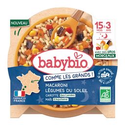 PÂTES macaroni cuites* 32% (eau, semoule de BLÉ dur*, blanc d' ŒUF*), carottes des Landes* 24%, aubergines* 13%, eau de cuisson, purée de tomates de Nouvelle-Aquitaine*, poivrons rouges d'Espagne* 6%, maïs doux d'Aquitaine* 6%, amidon de maïs*, thym de France*, ail d'Espagne*. *Ingrédients issus de l'agriculture biologique