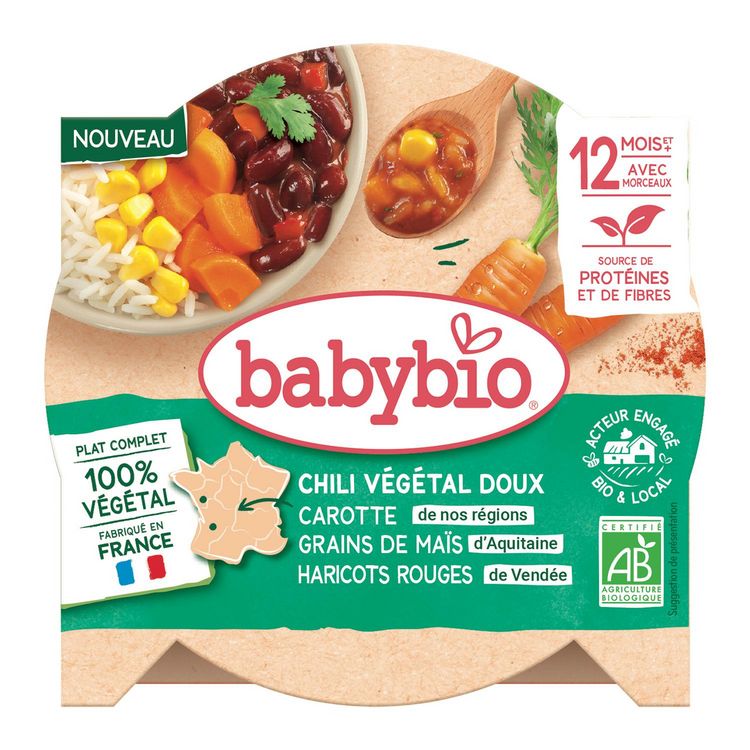 Carottes de France* 25%, riz cuit* 21% (eau, riz*), maïs d'Aquitaine* 14%, eau de cuisson, haricots rouges cuits de Vendée* 11% (haricots rouges*, eau), poivrons d'Espagne* 10%, purée de tomates de Nouvelle-Aquitaine* 5%, coriandre*, paprika*, cumin*. *Ingrédients issus de l'agriculture biologique