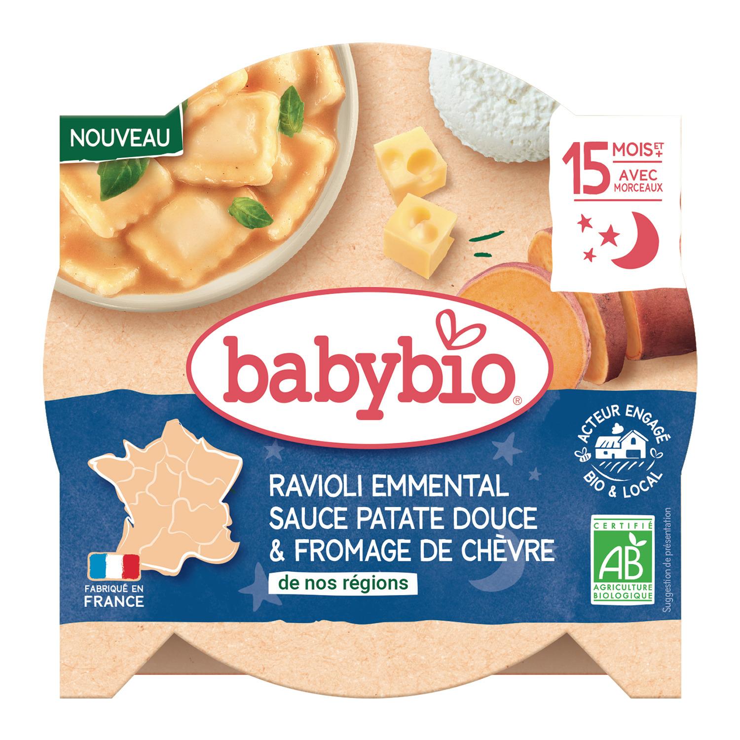RAVIOLI cuits* 60% (eau, PÂTE* (semoule de BLÉ dur*, eau), farce* ( FROMAGE BLANC de France*, flocons de pomme de terre*, EMMENTAL* 1%, eau, basilic*, huile de tournesol de France*, muscade*)), patates douces de France* 17%, eau de cuisson, FROMAGE DE CHÈVRE de France* 4.5%, oignons de France* 4%, MOZZARELLA de Suisse* 2,3%, fécule de manioc*, ail d'Espagne*,muscade*. *Ingrédients issus de l'agriculture biologique