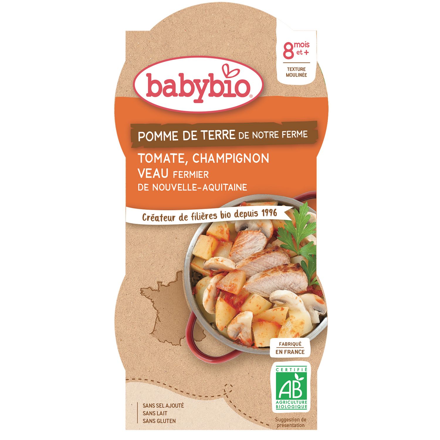 Pommes de terre de notre Ferme* 40%, purée de tomates de France* 15%, champignons* 12%, eau de cuisson, viande de veau fermier de Nouvelle-Aquitaine* 8%, carottes de France* 8%, purée d'oignons de notre Ferme* 6%, huiles végétales* (colza*, tournesol*), persil de France*. *Ingrédients issus de l'agriculture biologique