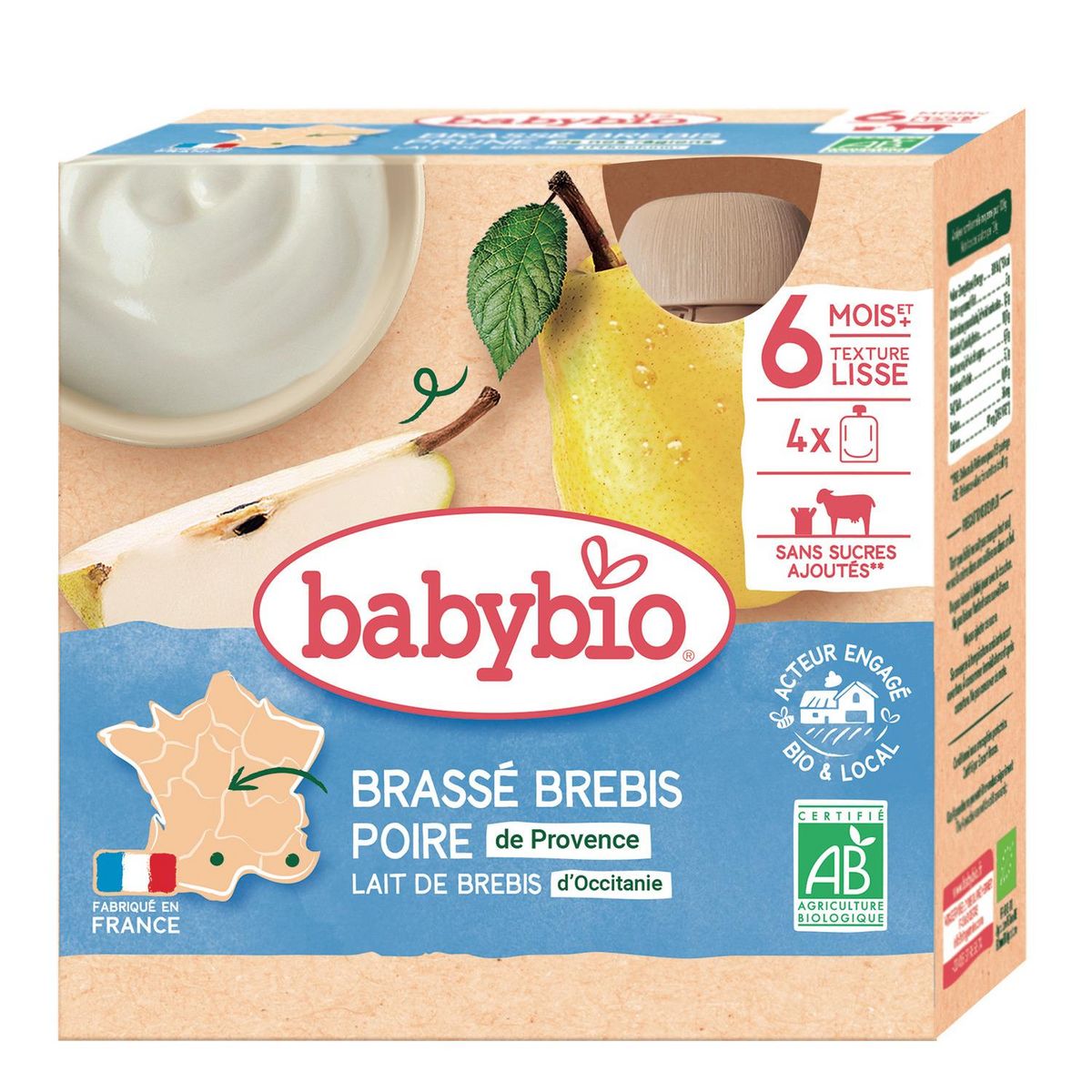 LAIT fermenté de brebis d'Occitanie* 52%, poires de Provence* 40%, fécule de manioc*, épaississant : pectine de fruits, jus concentré de citron d'Espagne*. *Ingrédients issus de l'agriculture biologique