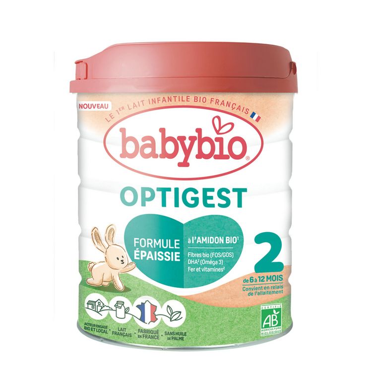 Optigest est un lait infantile épaissi bio en poudre, qui prend soin de bébé et la nature : une recette épaissie à l'amidon bio et fabriquée en France, sans huile de palme et avec du lait bio français.