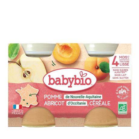 Pommes de Nouvelle-Aquitaine* 60,7%, abricots d'Occitanie* 37%, riz de Camargue IGP* 2%, jus concentré de citron d'Espagne*. *Ingrédients issus de l'agriculture biologique