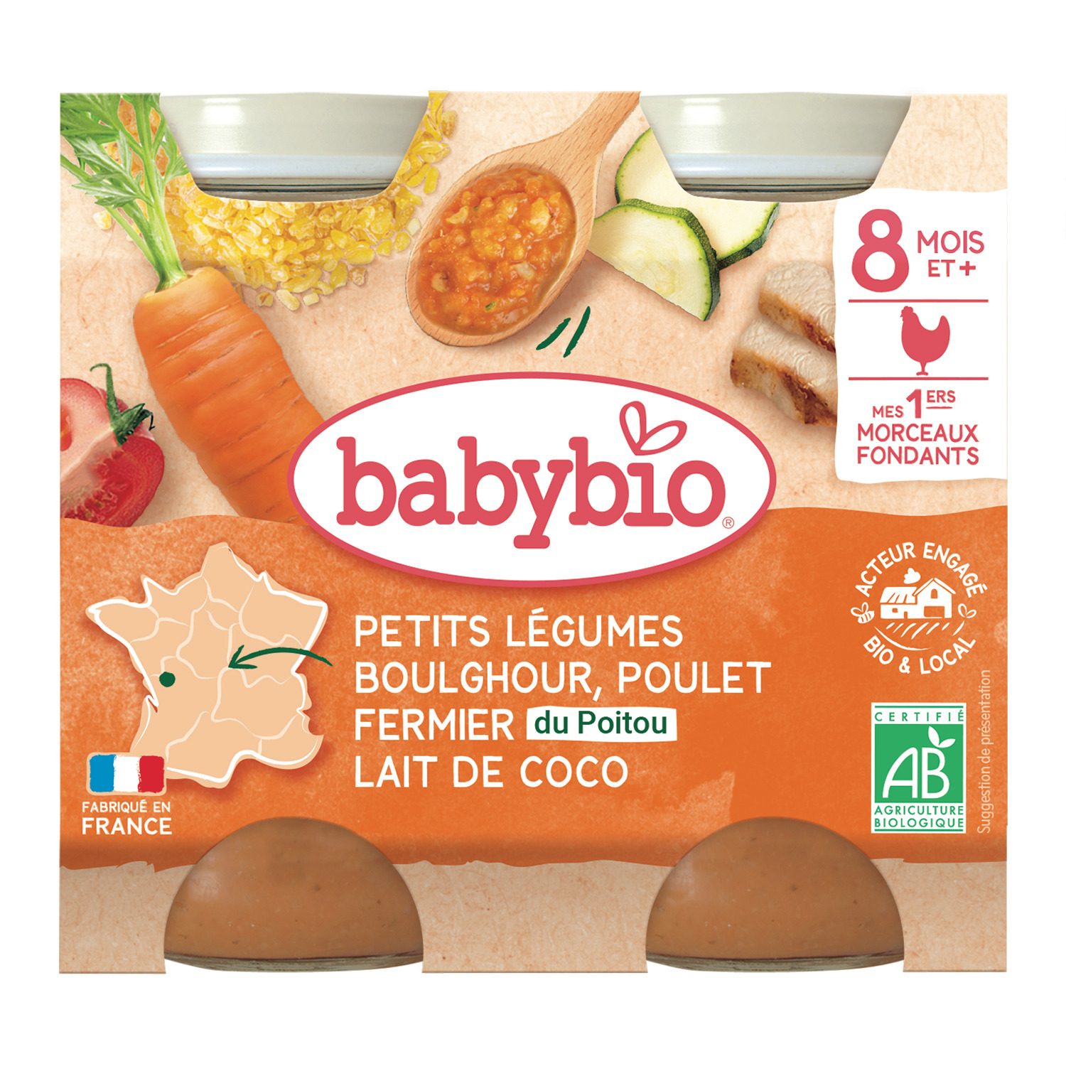 BOULGHOUR cuit* 19% (eau, BOULGHOUR*), carottes de France* 18%, purée de tomates de Nouvelle-Aquitaine* 15,5%, purée de courgettes de notre Ferme en Pays de la Loire* 15,5%, eau de cuisson, viande de poulet fermier du Poitou* 8%, oignons de France* 8%, lait de coco du Sri Lanka* 6% (noix de coco*, eau), coriandre de France*. *Ingrédients issus de l'agriculture biologique